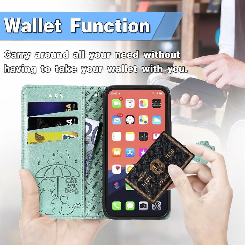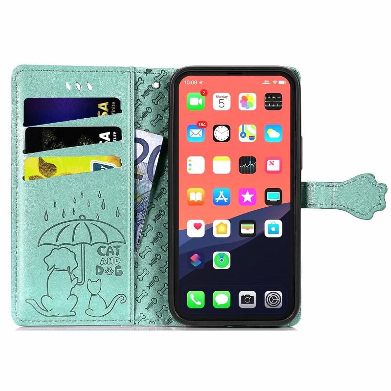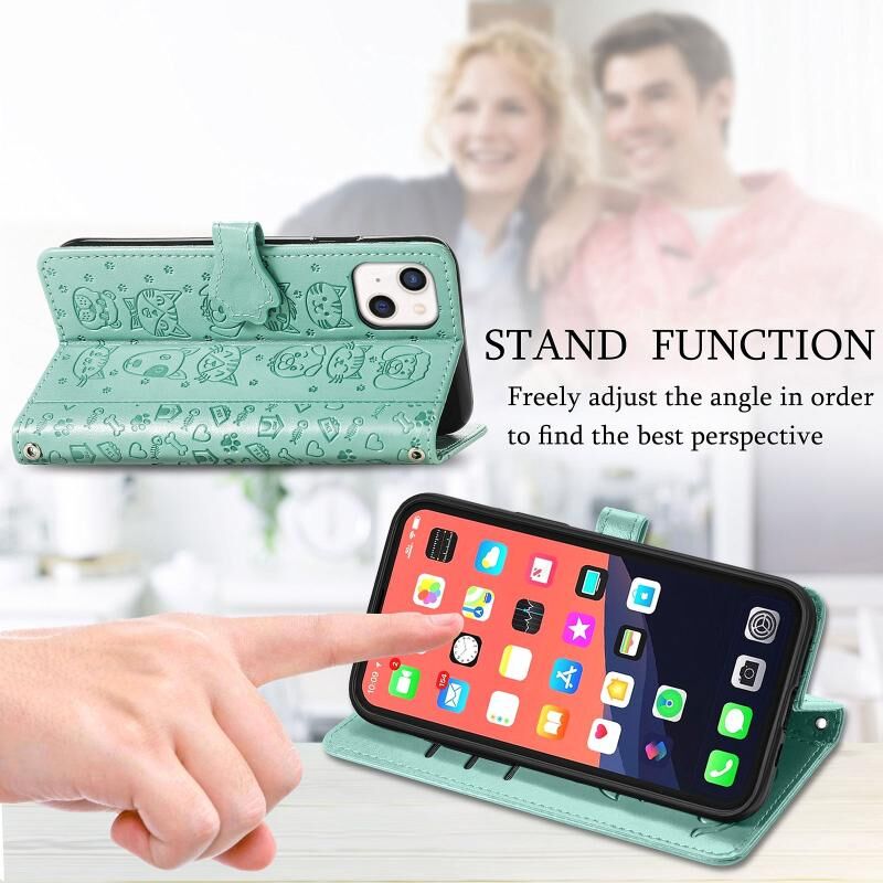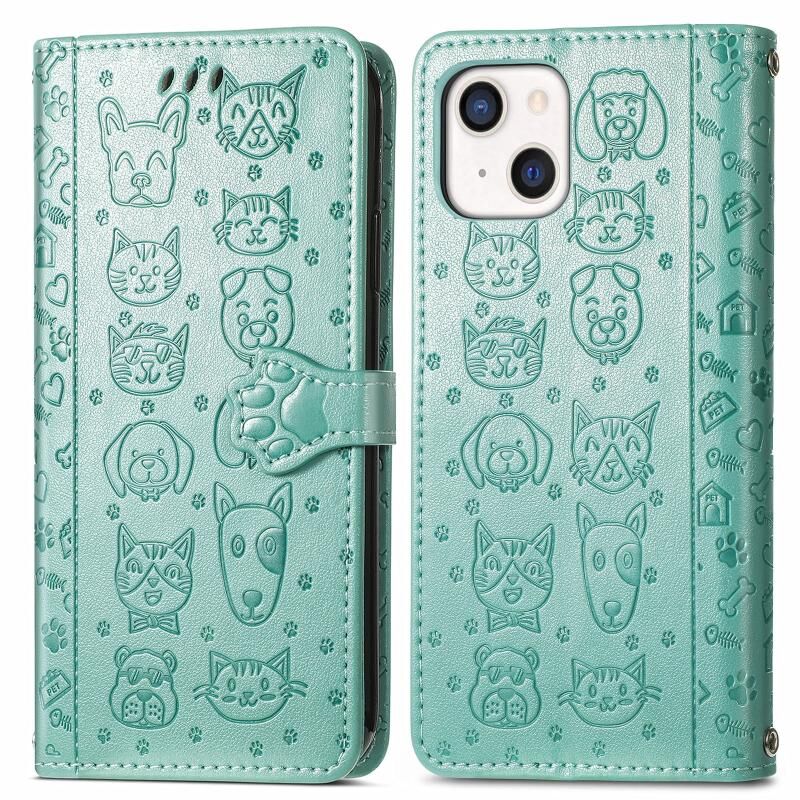 Θήκη δέρματος οριζόντιας αναδίπλωσης για iPhone 13 mini με χαριτωμένα ανάγλυφα σχέδια γάτας και σκύλου, με βάση, θήκες καρτών, πορτοφόλι και κορδόνι (Ροζ)