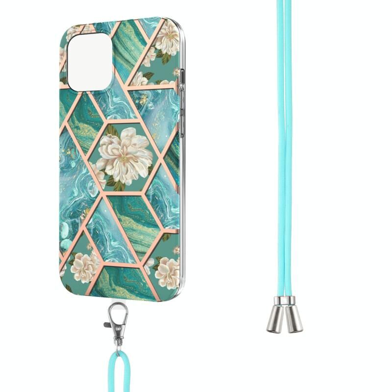 Θήκη για iPhone 13 mini με ηλεκτρολυτική επιμετάλλωση, συνδυασμό μαρμάρου και λουλουδιών, από TPU με προστασία από κραδασμούς και λουρί (Ροζ Λουλούδι)