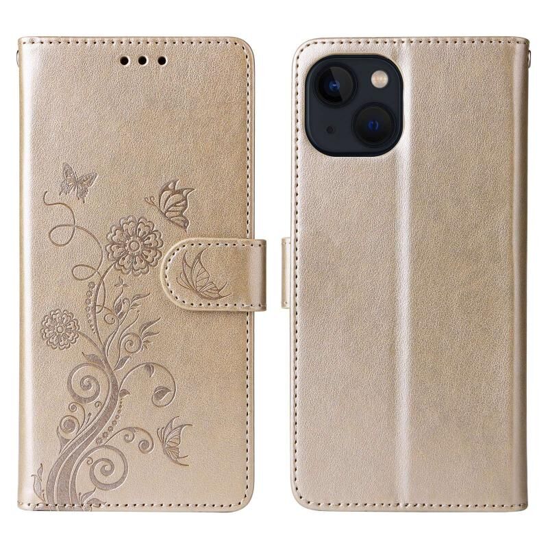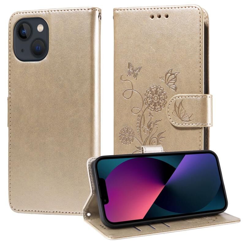 Θήκη τηλεφώνου από δέρμα με ανάγλυφα σχέδια πεταλούδας και λουλουδιών για iPhone 13 mini (Χρυσό)