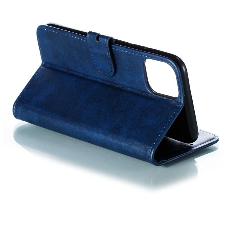 Θήκη για iPhone 13 mini με ανάγλυφο σχέδιο χαρούμενης γάτας, οριζόντια, από δέρμα με βάση & θήκες για κάρτες & πορτοφόλι (Μπλε)