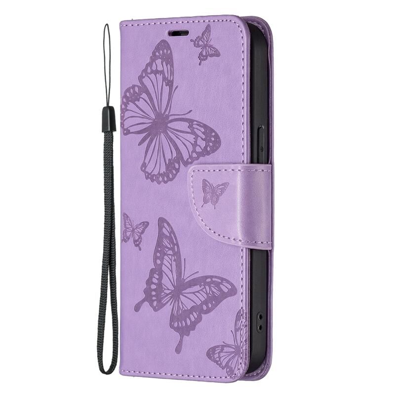 Θήκη για iPhone 13 mini με ανάγλυφο σχέδιο δύο πεταλούδων, οριζόντια, από δερματίνη PU με βάση στήριξης, θήκη για κάρτες, πορτοφόλι και λουρί (Γκρι)