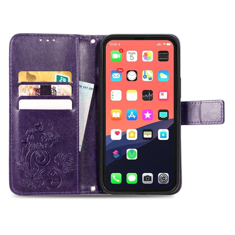 Θήκη δερμάτινη για iPhone 13 mini με σχέδιο τριφυλλιού, ανάγλυφη αγκράφα, προστασία κινητού, λουρί, θήκη για κάρτες, πορτοφόλι και λειτουργία βάσης (Μωβ)