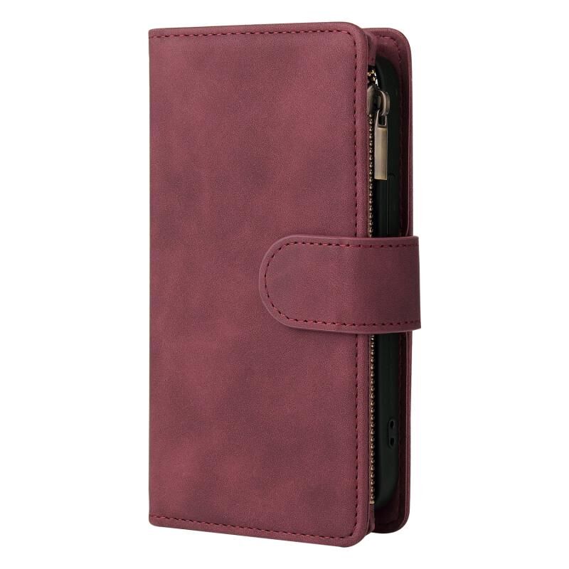 Θήκη τηλεφώνου από δέρμα πολλαπλών χρήσεων για iPhone 13 mini με θήκη καρτών & στήριξη & πορτοφόλι με φερμουάρ & κορνίζα φωτογραφιών (Κρασοκόκκινο)
