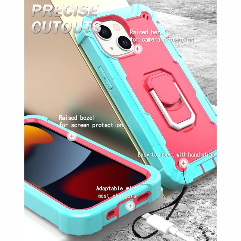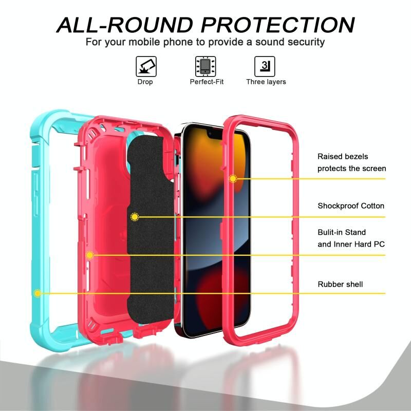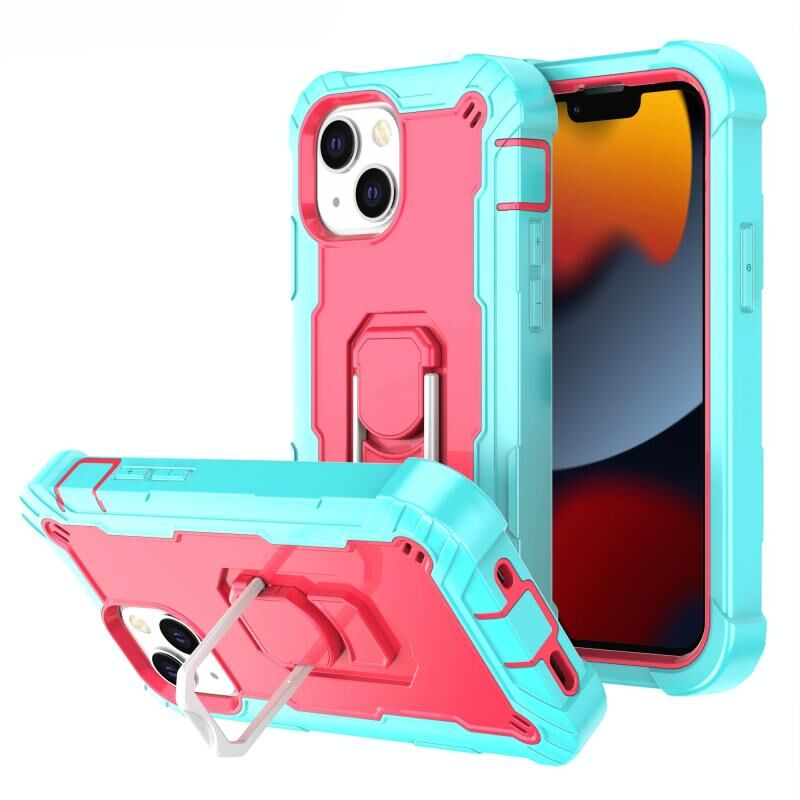 For iPhone 13 mini PC + Rubber 3-layers Shockproof Protective Case with Rotating Holder (Mint Green + Rose Red)