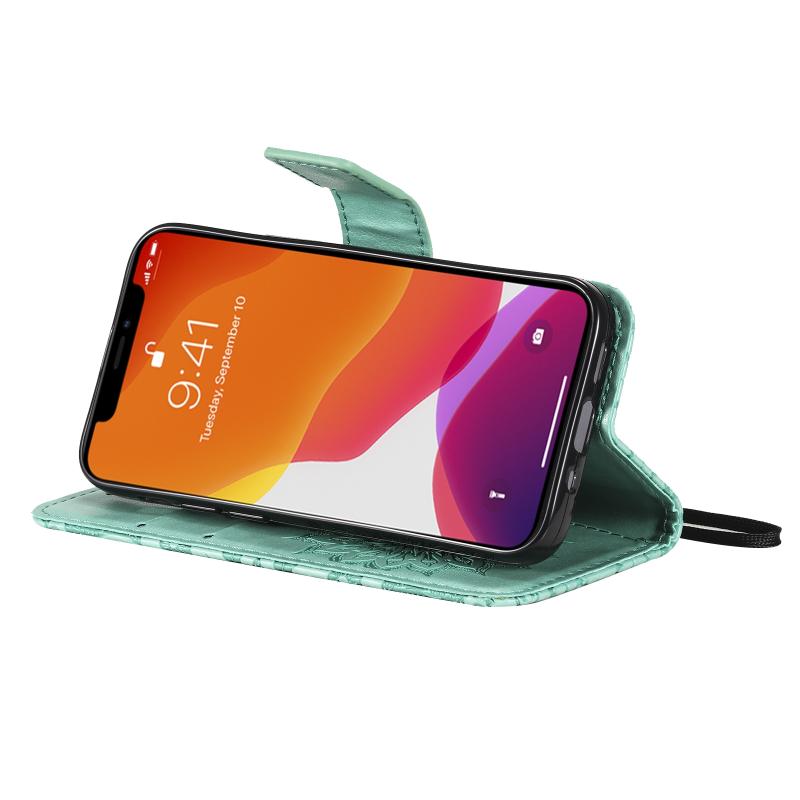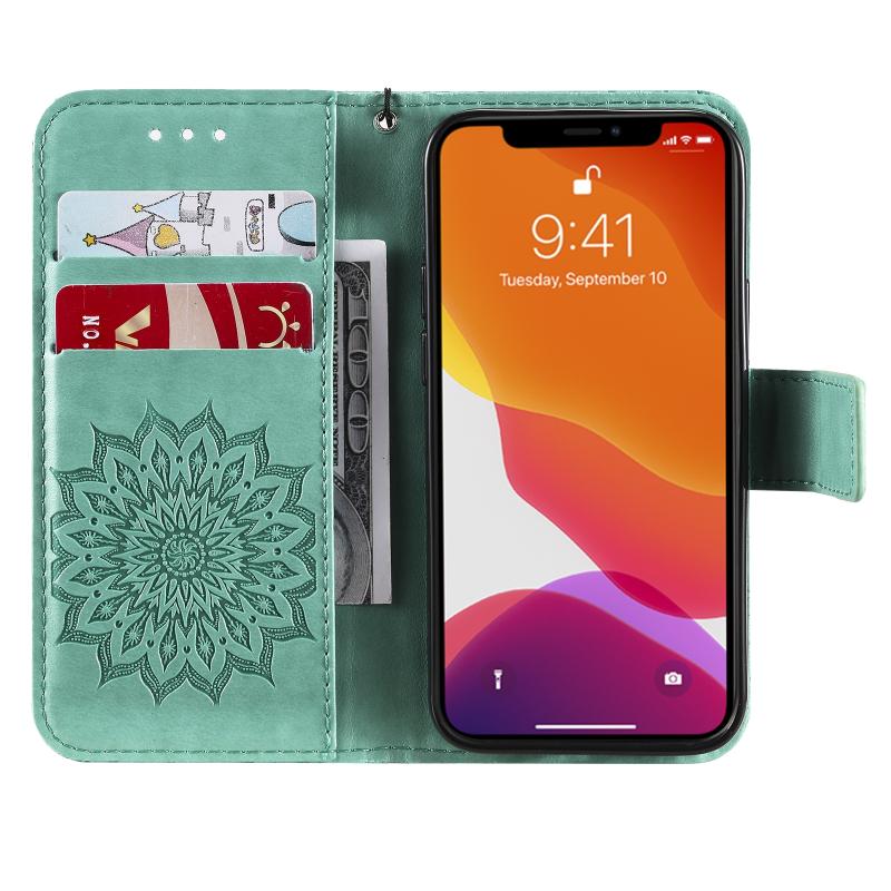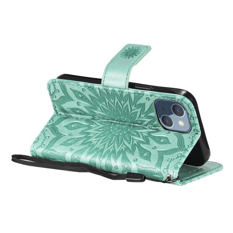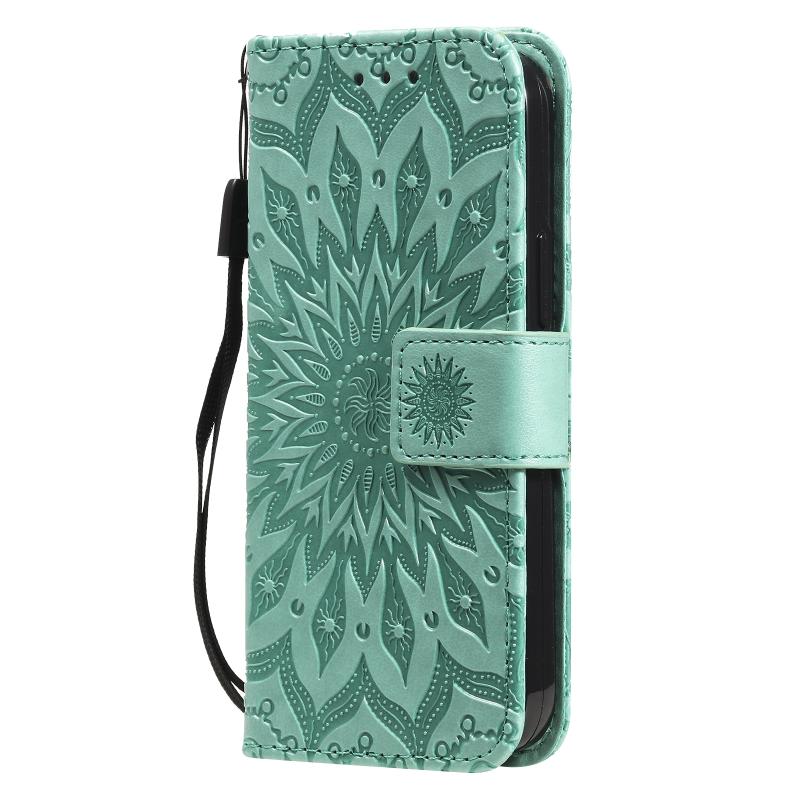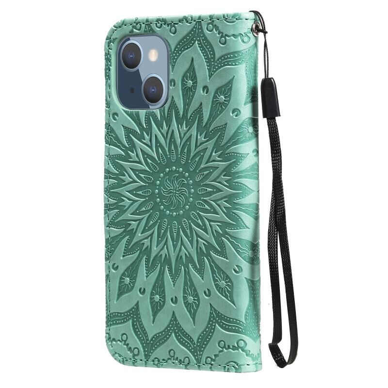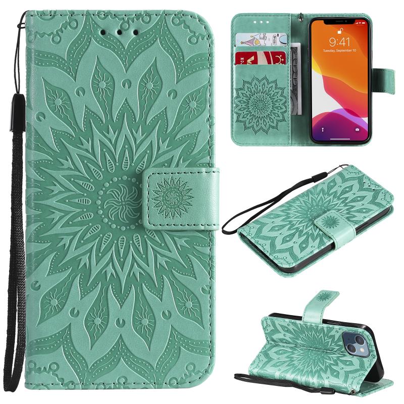 For iPhone 13 mini Pressed Printing Sunflower Pattern Horizontal Flip PU Leather Case Holder & Card Slots & Wallet & Lanyard (Green)