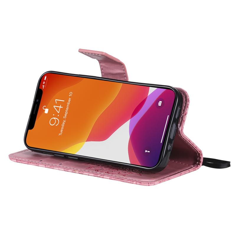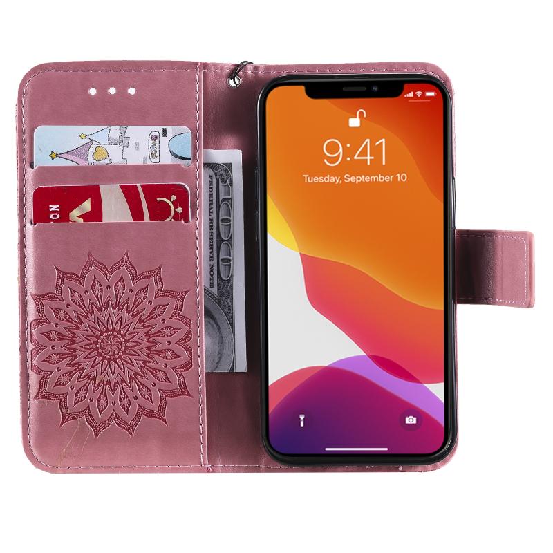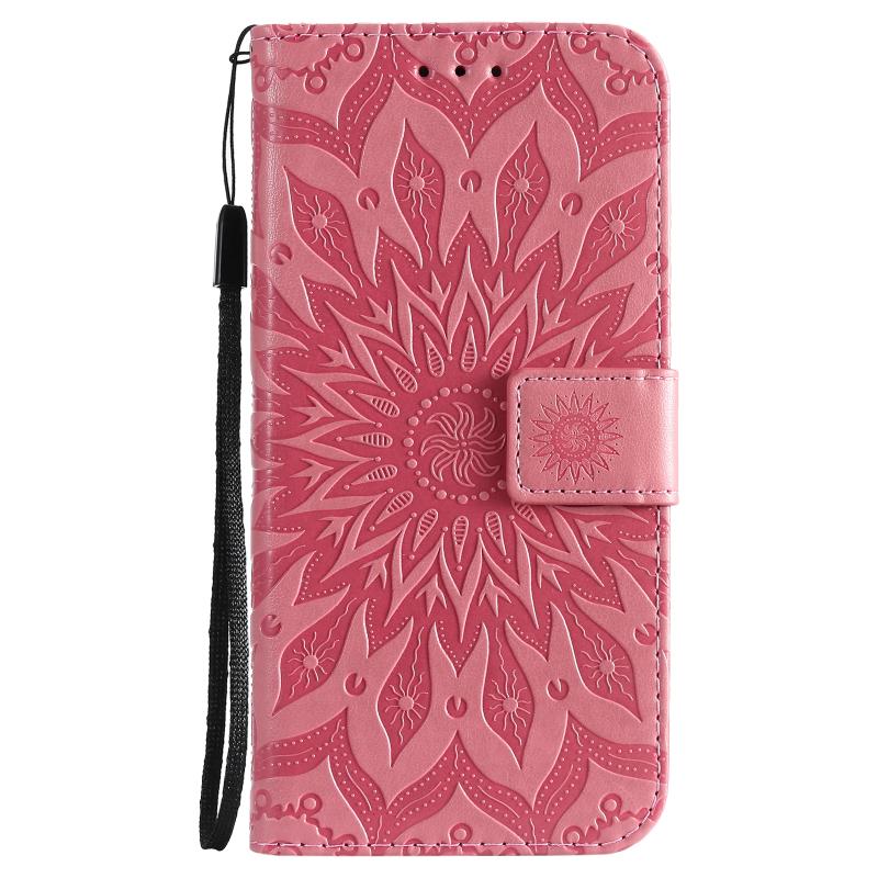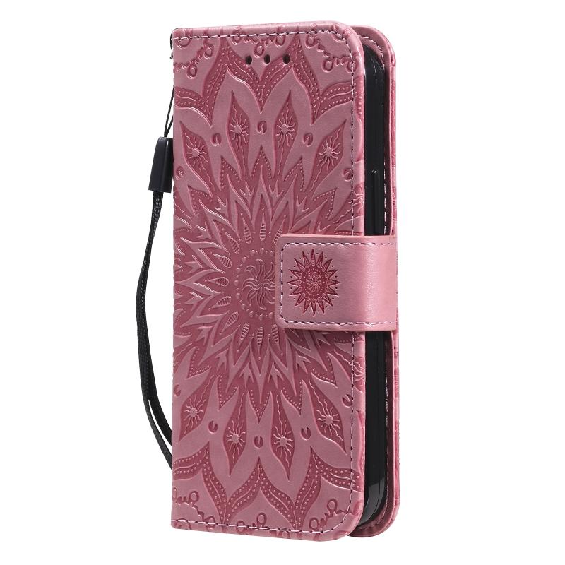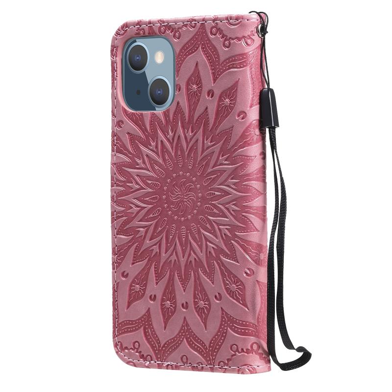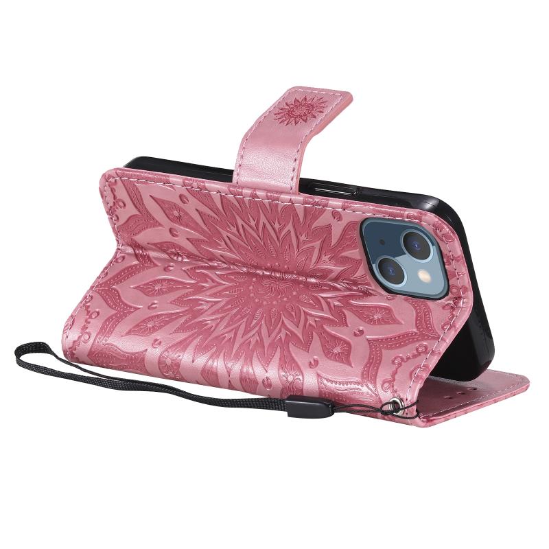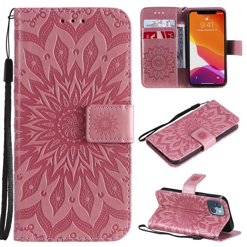 For iPhone 13 mini Pressed Printing Sunflower Pattern Horizontal Flip PU Leather Case Holder & Card Slots & Wallet & Lanyard (Pink)