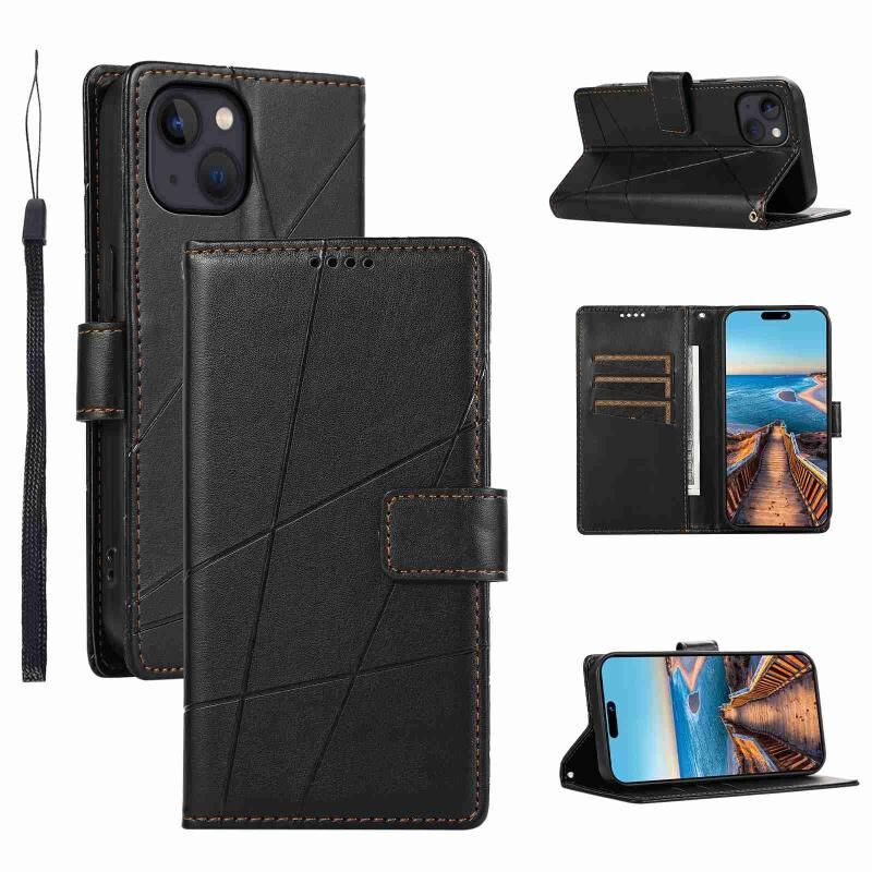 Θήκη τηλεφώνου για iPhone 13 mini από γνήσιο δέρμα PU με ανάγλυφη υφή και λεπτομέρεια γραμμής (Μαύρο)