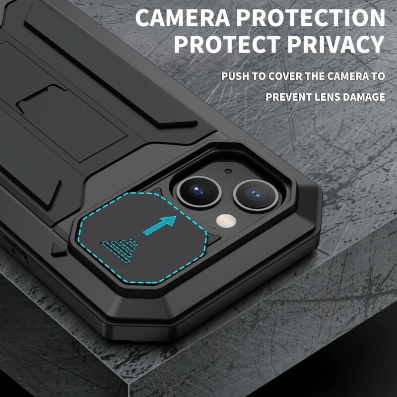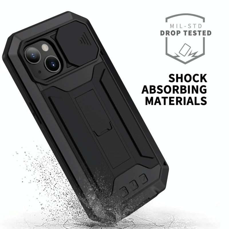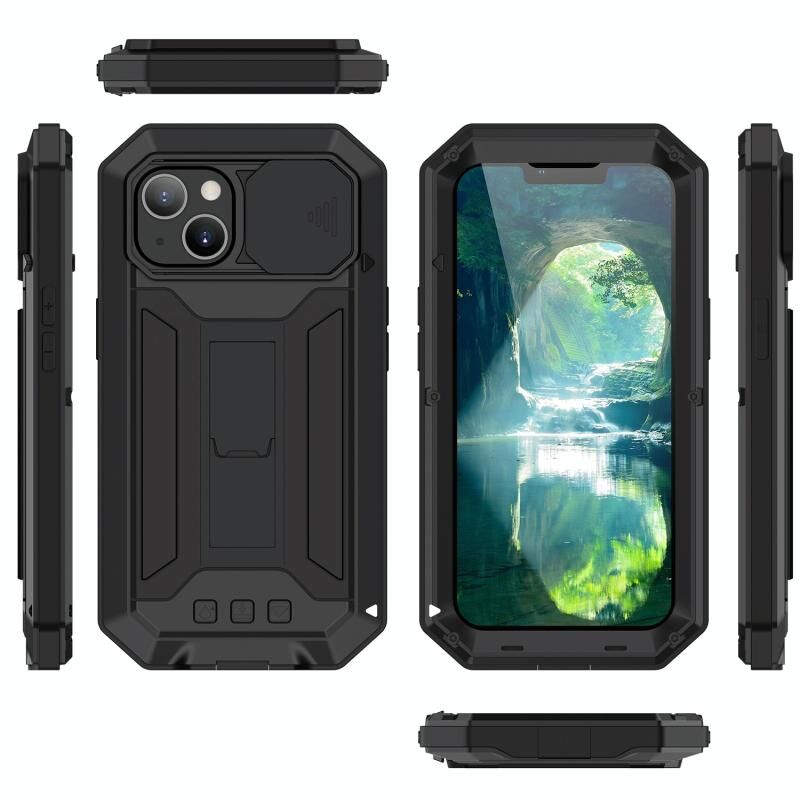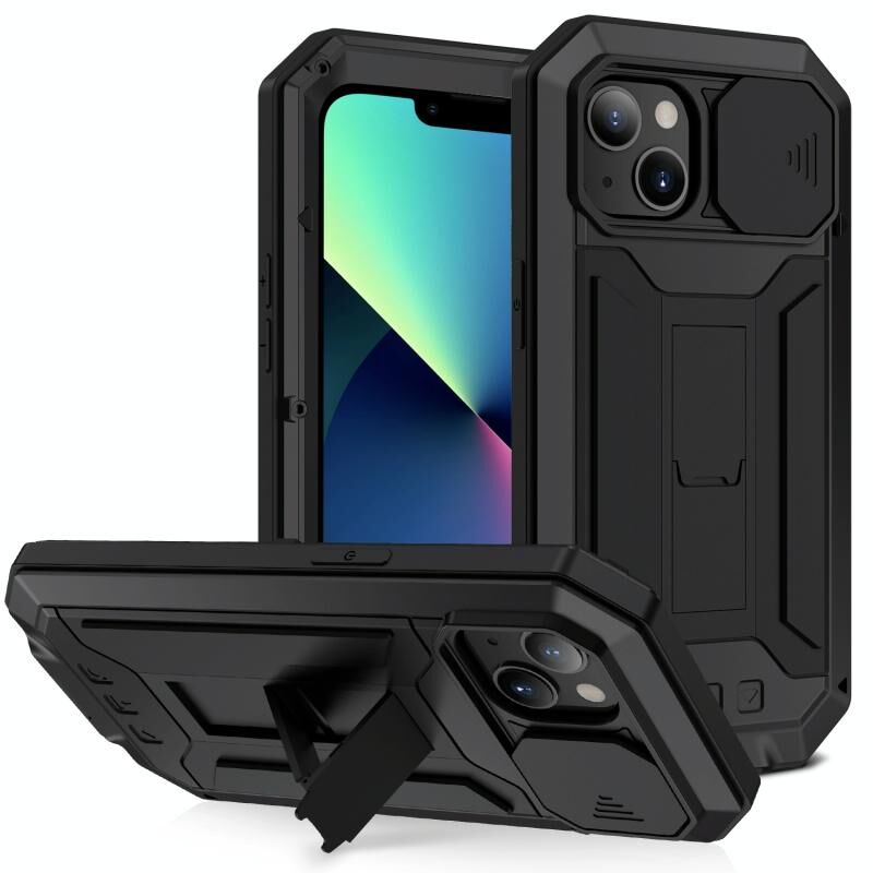 For iPhone 13 mini R-JUST Sliding Camera Shockproof Life Waterproof Dust-proof Metal + Silicone Protective Case with Holder (Black) (R-JUST)