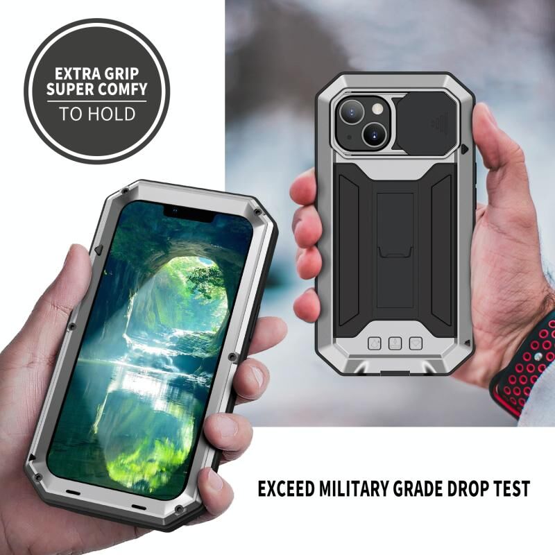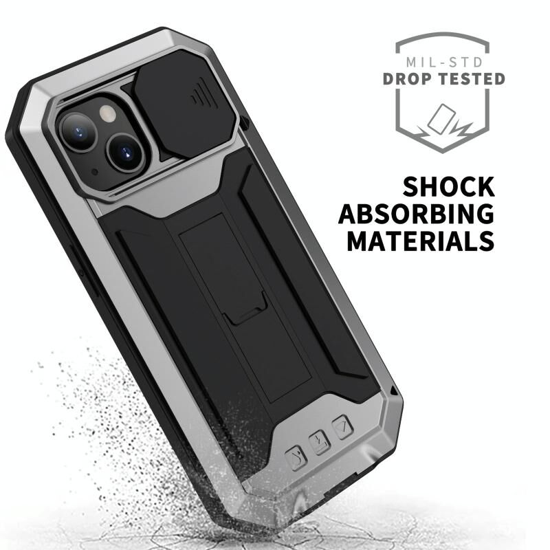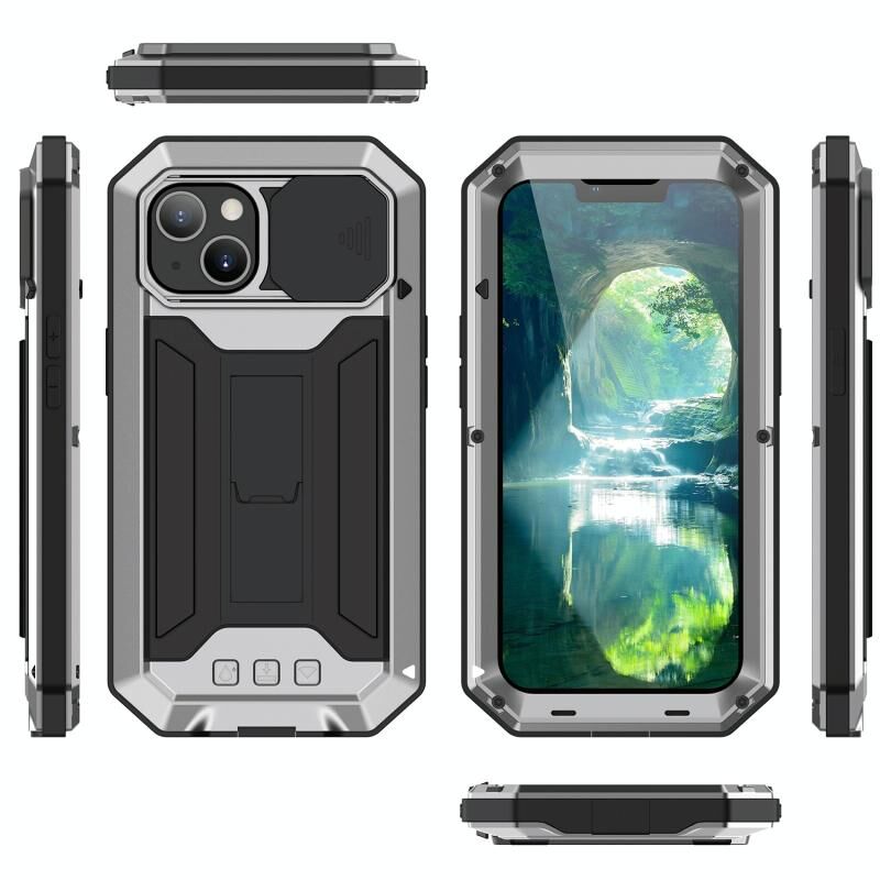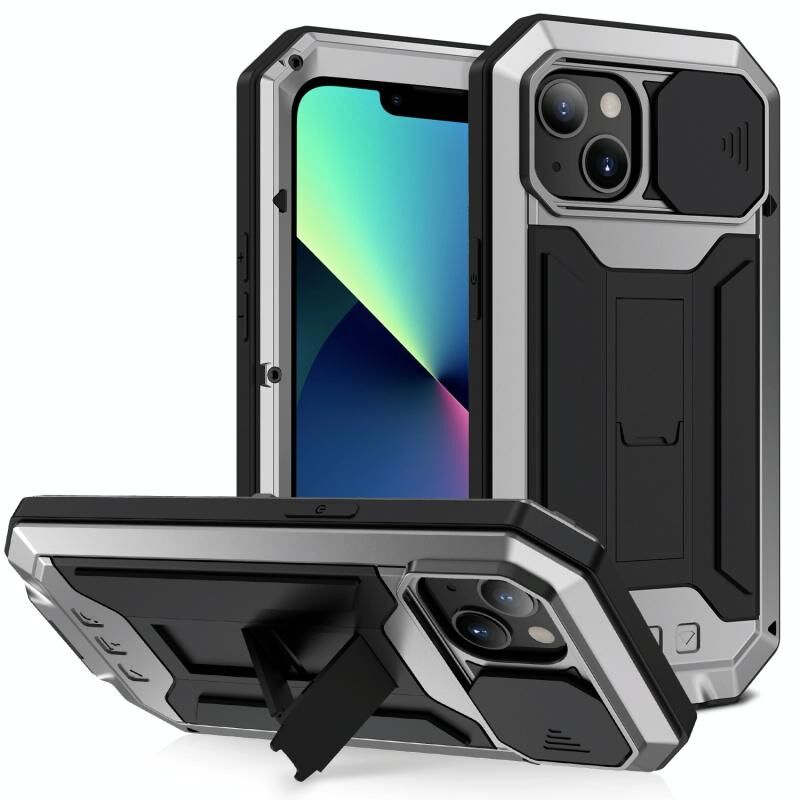 For iPhone 13 mini R-JUST Sliding Camera Shockproof Life Waterproof Dust-proof Metal + Silicone Protective Case with Holder (Silver) (R-JUST)