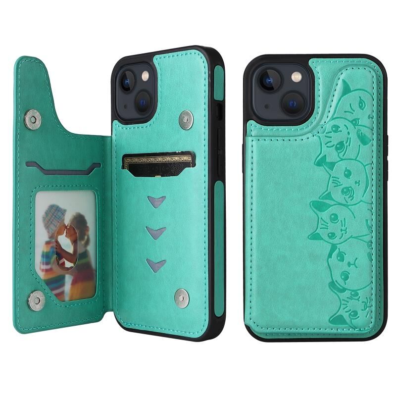 Θήκη κινητού τηλεφώνου για iPhone 13 mini με ανάγλυφο σχέδιο έξι γατών, αντικραδασμική (Πράσινη)
