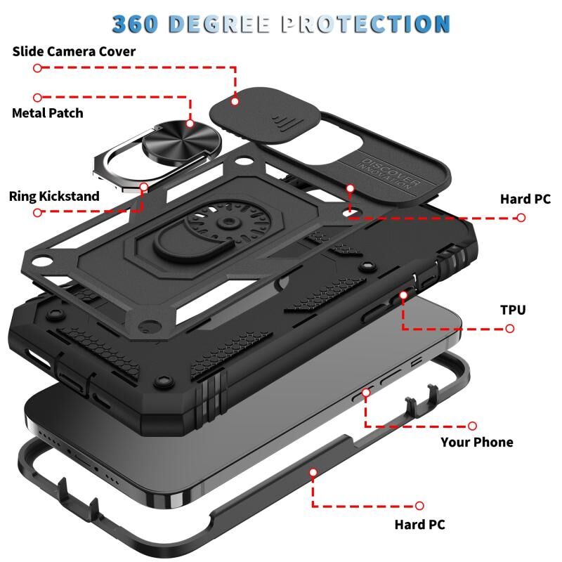Θήκη προστασίας για iPhone 13 mini με σχεδιασμό συρόμενου καλύμματος κάμερας, κατασκευασμένη από TPU + PC, με περιστρεφόμενη βάση 360 μοιρών & υποδοχή κάρτας (Λευκό+Μαύρο)