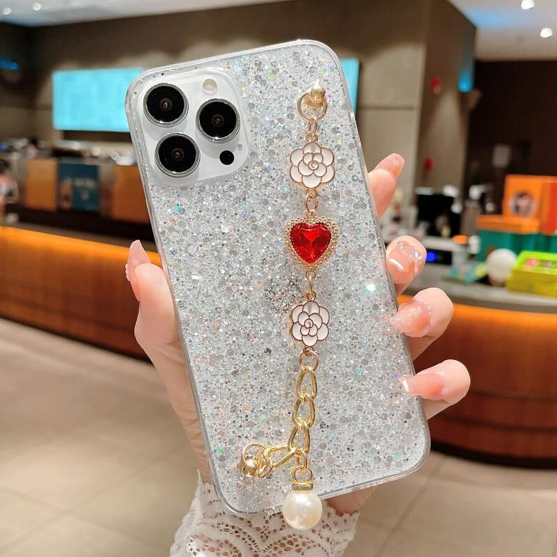 Θήκη τηλεφώνου για iPhone 13 mini, αστραφτερά παγιέτες, αμόρε, αλυσίδα, εποξειδική ρητίνη, TPU (Ασημί)