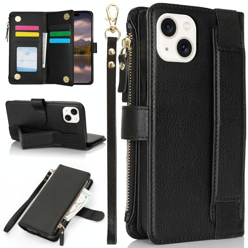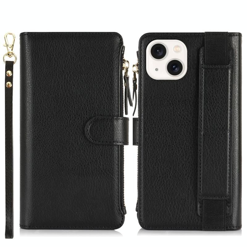 Θήκη για iPhone 13 mini με Βραχιόλι, Πορτοφόλι με Φερμουάρ, Δέρμα με Προστασία RFID (Μαύρο)