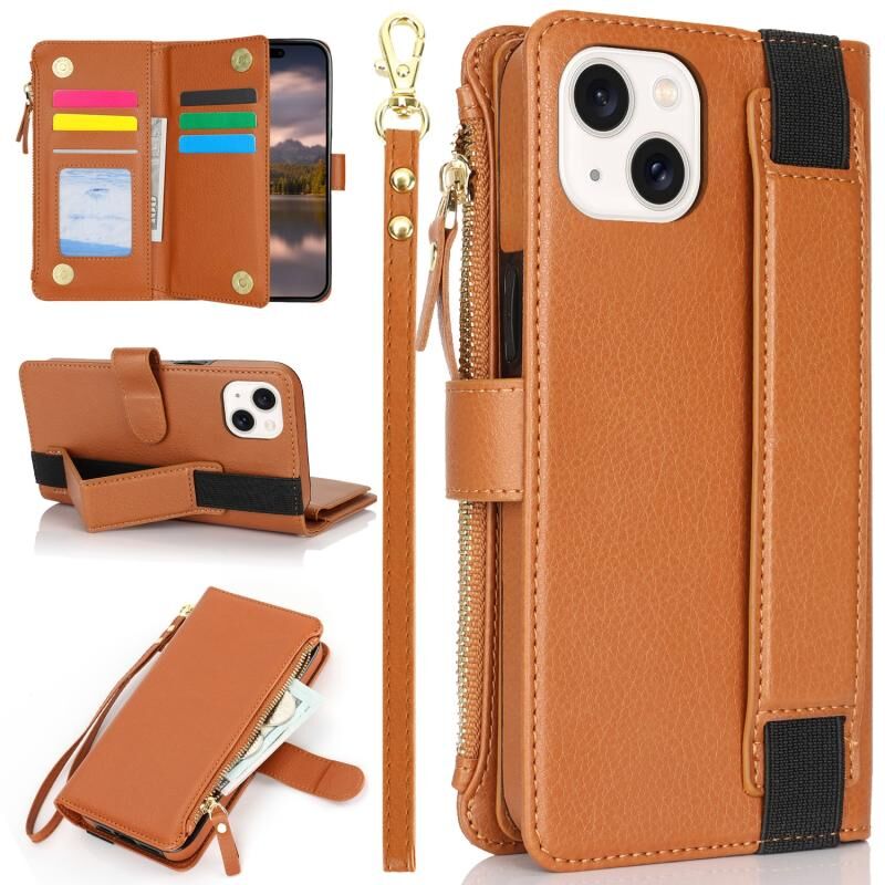 For iPhone 13 mini Wristband Holder Zipper Purse RFID Leather Phone Case(Brown)