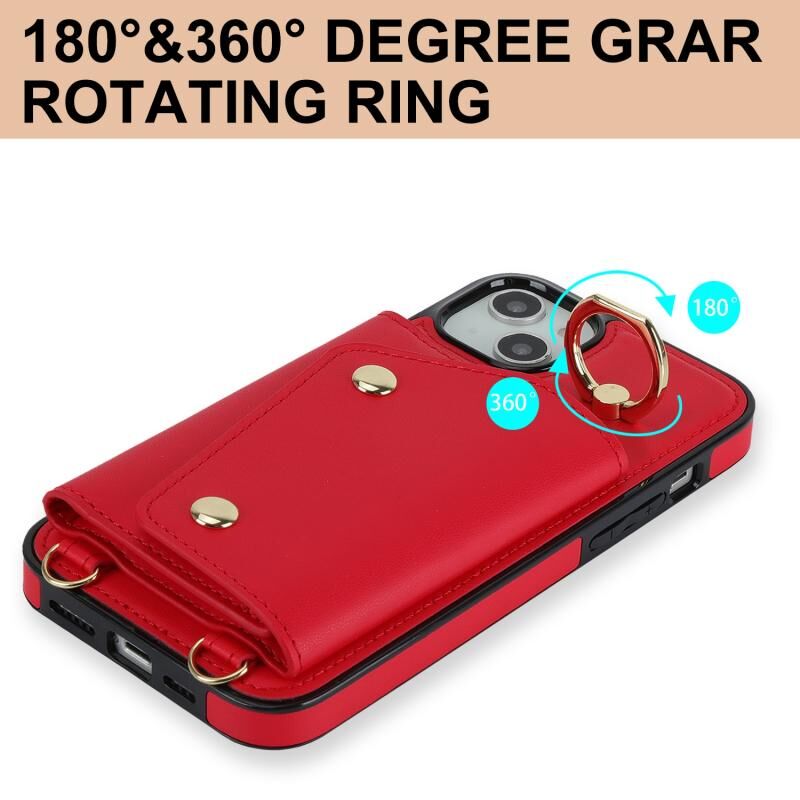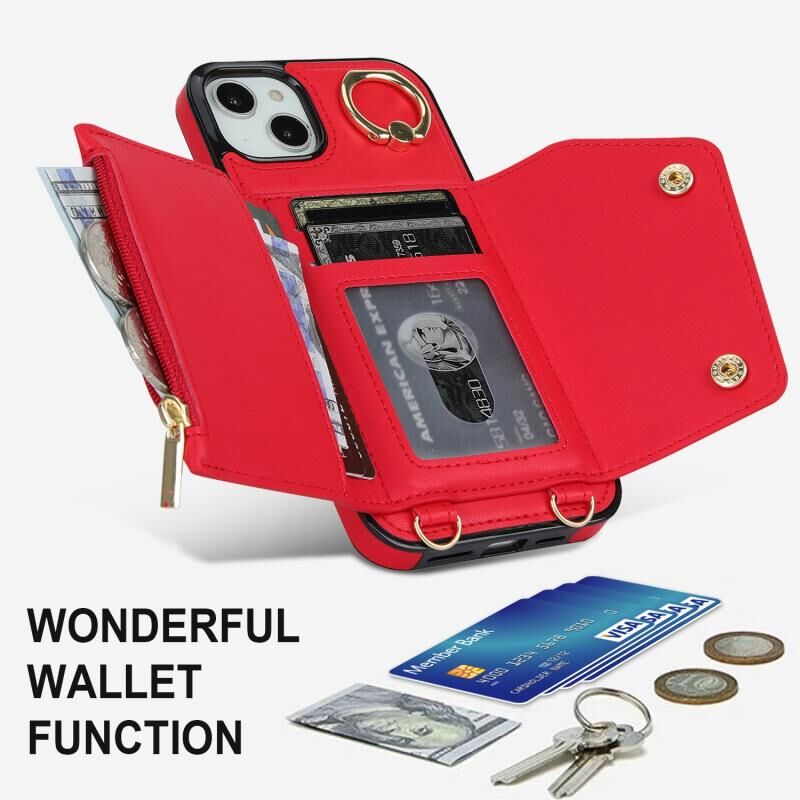 For iPhone 13 mini Zipper Card Bag Phone Case with Dual Lanyard(Red)