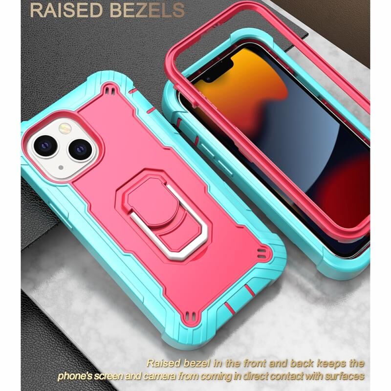 For iPhone 13 PC + Rubber 3-layers Shockproof Protective Case with Rotating Holder(Mint Green + Rose Red)