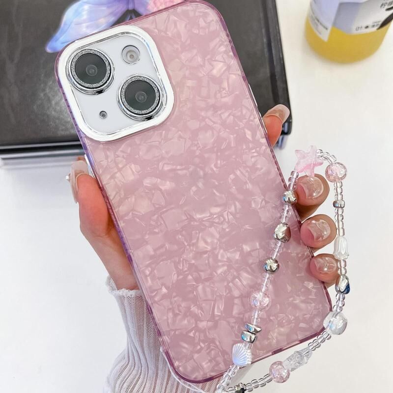 For iPhone 13 Plating Glitter Texture Chain Wristband TPU Phone Case with Lens Film(Pink Shell Pattern)