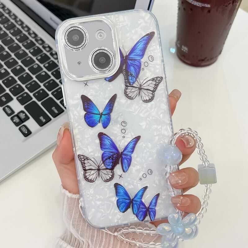 Θήκη iPhone 13 με Λουράκι Καρπού, Υφή Butterfly & Προστασία Φακού Glitter (Μπλε Πεταλούδες HU3)