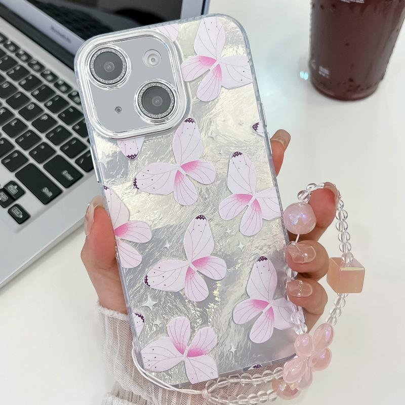 Θήκη iPhone 13 με Λουράκι Καρπού, Υφή Butterfly & Προστασία Φακού Glitter (Ροζ Πεταλούδες HU5)