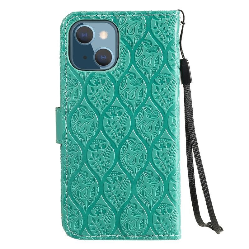 Θήκη για iPhone 13 με ανάγλυφο σχέδιο λουλουδιών από ρατάν, οριζόντια, από δερματίνη PU με βάση στήριξης, θήκες για κάρτες, πορτοφόλι & κορνίζα φωτογραφιών (Μπλε)