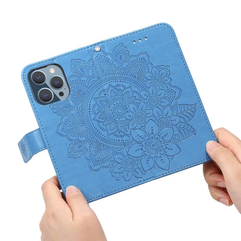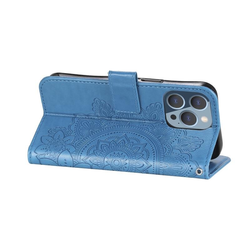 For iPhone 13 Pro 7-petal Flowers Embossing Pattern Horizontal Flip PU Leather Case with Holder & Card Slots & Wallet & Photo Frame (Blue)