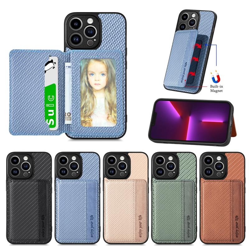 For iPhone 13 Pro Carbon Fiber Magnetic Card Bag Phone Case(Khaki)