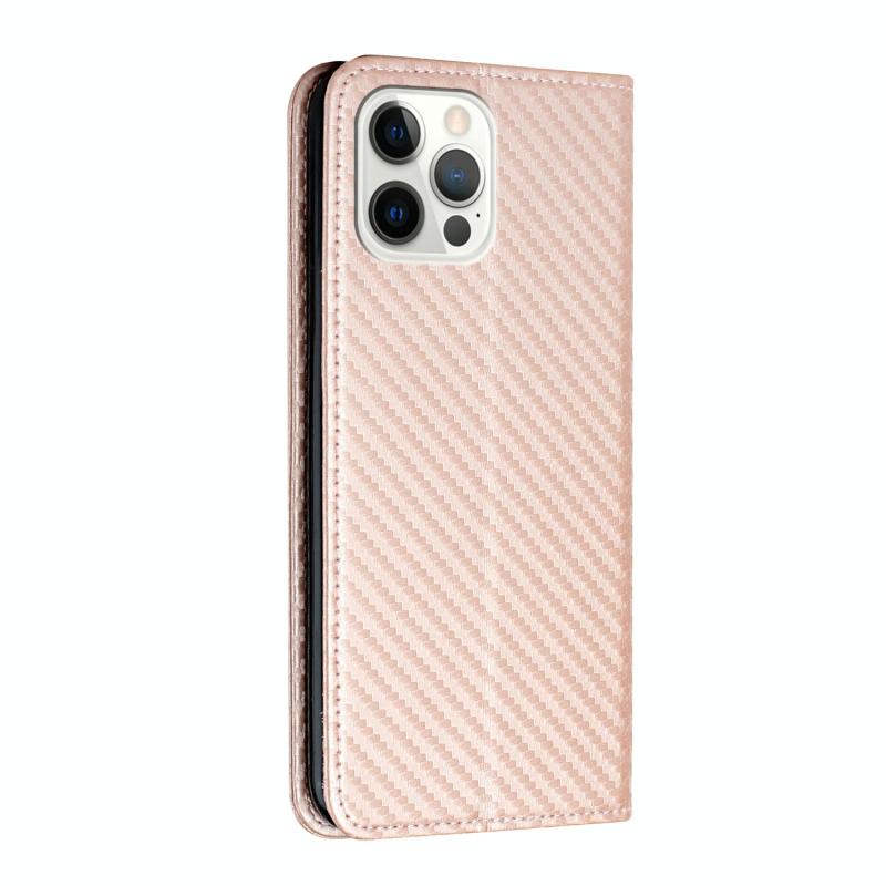 For iPhone 13 Pro Carbon Fiber Texture Flip Holder Leather Phone Case (Rose Gold)
