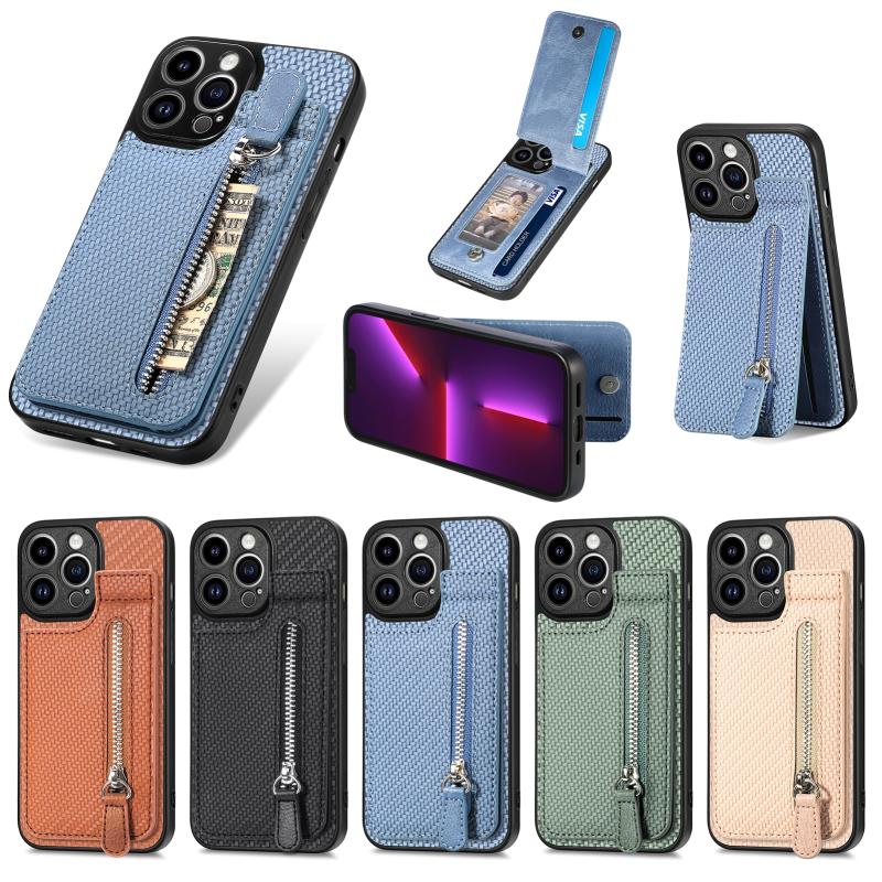 For iPhone 13 Pro Carbon Fiber Vertical Flip Zipper Phone Case(Green)