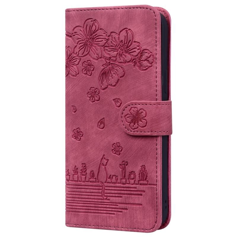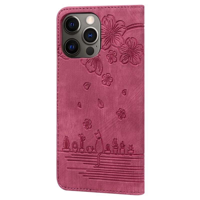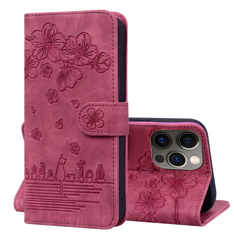 For iPhone 13 Pro Cartoon Sakura Cat Embossed Leather Case (Wine Red)