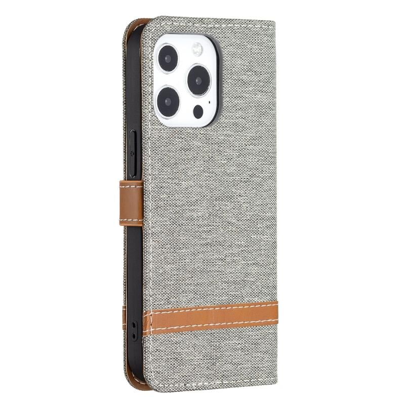 Θήκη για iPhone 13 Pro με υφή τζιν, οριζόντια, αναδιπλούμενη από δέρμα, σε μοβ χρώμα, με βάση στήριξης, θήκες για κάρτες, πορτοφόλι και κορδόνι.