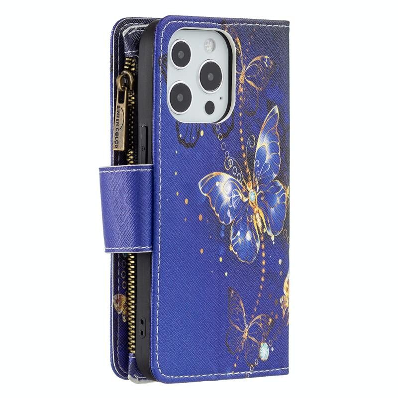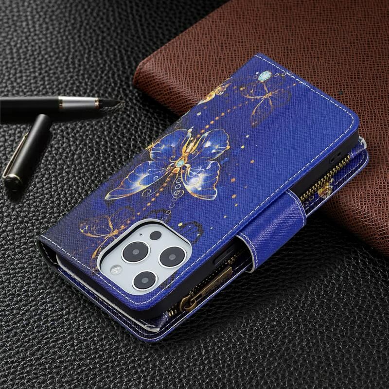 For iPhone 13 Pro Colored Drawing Pattern Zipper Horizontal Flip Leather Case with Holder & Card Slots & Wallet (Purple Butterfly)