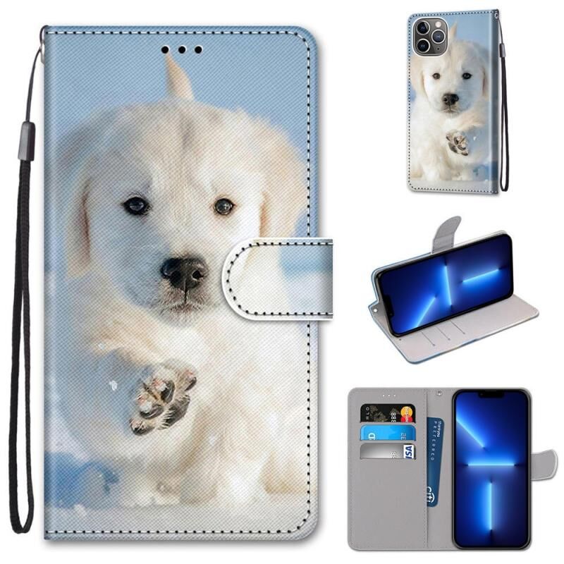 Θήκη για iPhone 13 Pro με πολύχρωμο σχέδιο, υφή σταυρού, οριζόντια αναδίπλωση από δερματίνη PU με βάση & θήκες για κάρτες & πορτοφόλι & κορδόνι (Snow Puppy)