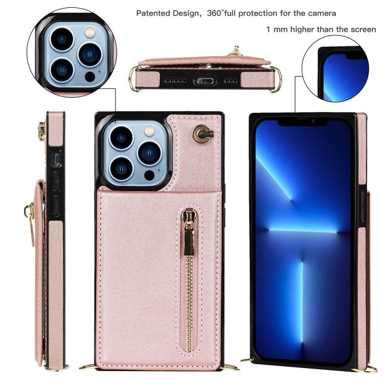 Θήκη κινητού για iPhone 13 Pro, διαγώνια, με φερμουάρ και τετράγωνο σχήμα, με λαβή (Μαύρο)