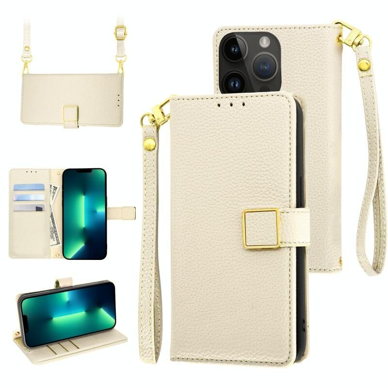 Θήκη τηλεφώνου από δέρμα με υφή λύτσι για iPhone 13 Pro, τύπου crossbody με τετράγωνη αγκράφα (Λευκό)