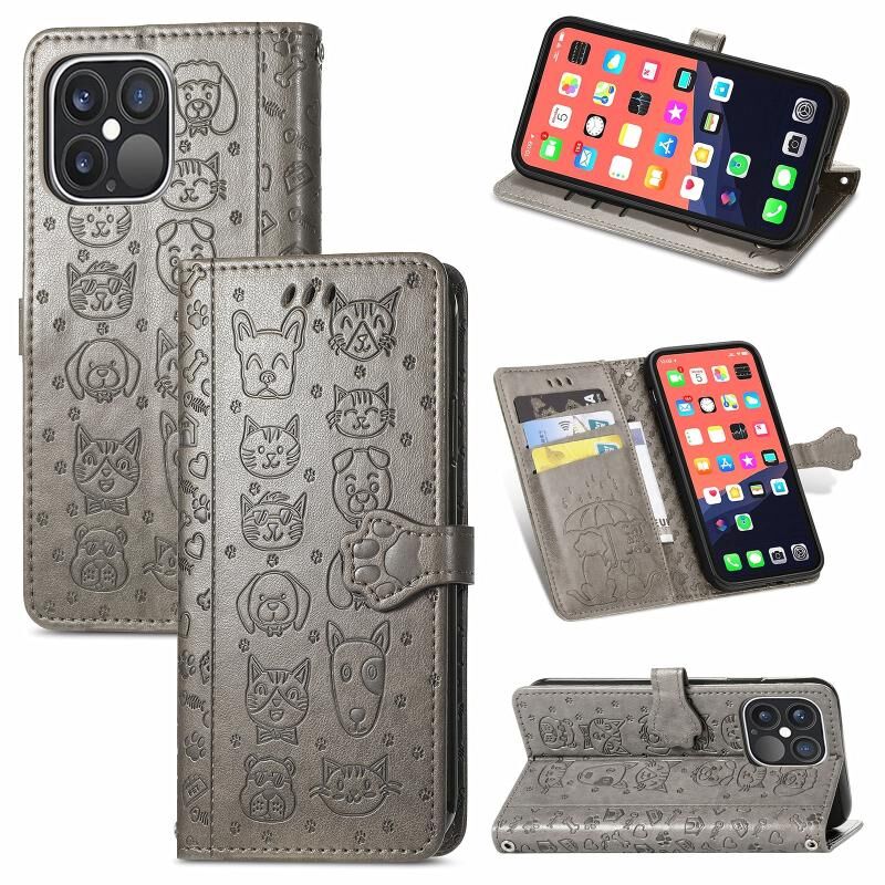 Θήκη δέρματος οριζόντιας αναδίπλωσης για iPhone 13 Pro με χαριτωμένο ανάγλυφο σχέδιο γάτας και σκύλου, με βάση, θήκες καρτών, πορτοφόλι και λουρί (Ροζ)