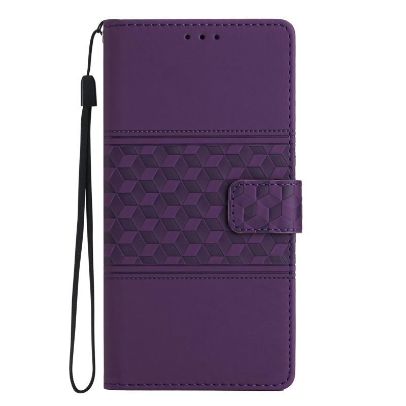 For iPhone 13 Pro Diamond Embossed Skin Feel Leather Phone Case with Lanyard(Purple)