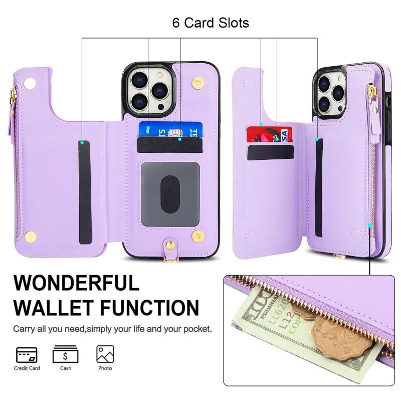 For iPhone 13 Pro Double Flap Zipper RFID Leather Phone Case with Short Lanyard(Light Purple)