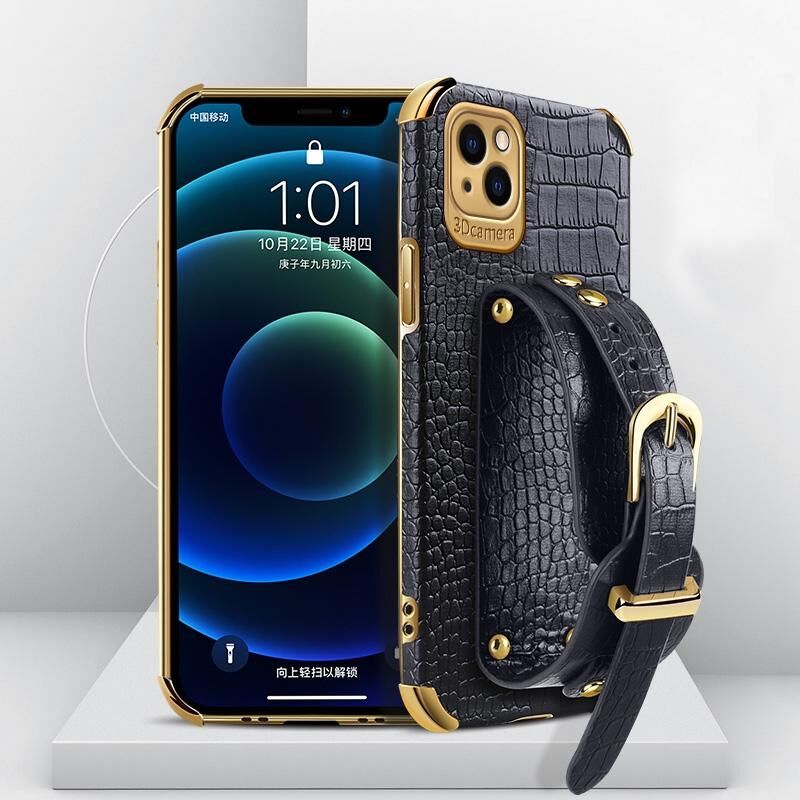 Θήκη για iPhone 13 Pro από TPU με ηλεκτρολυτική επίστρωση και σχέδιο δέρματος κροκόδειλου με λουρί καρπού (Μαύρο)