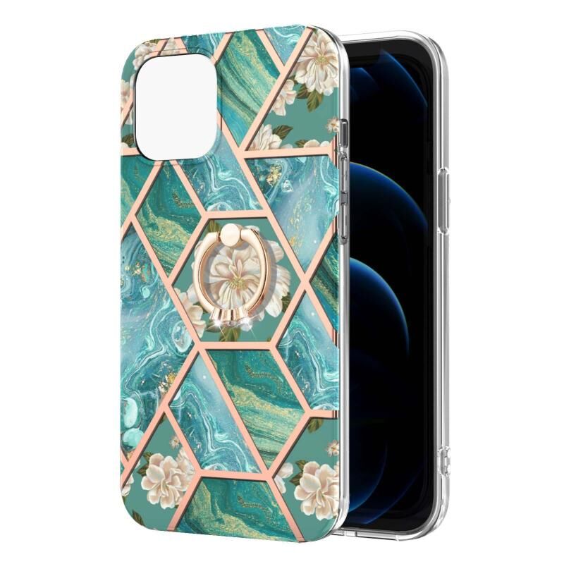 For iPhone 13 Pro Electroplating Splicing Marble Flower Pattern TPU Shockproof Case with Rhinestone Ring Holder (Blue Flower)