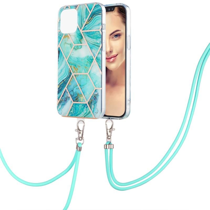 For iPhone 13 Pro Electroplating Splicing Marble Pattern Dual-side IMD TPU Shockproof Case with Neck Lanyard (Blue)