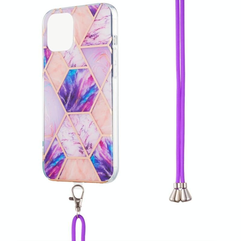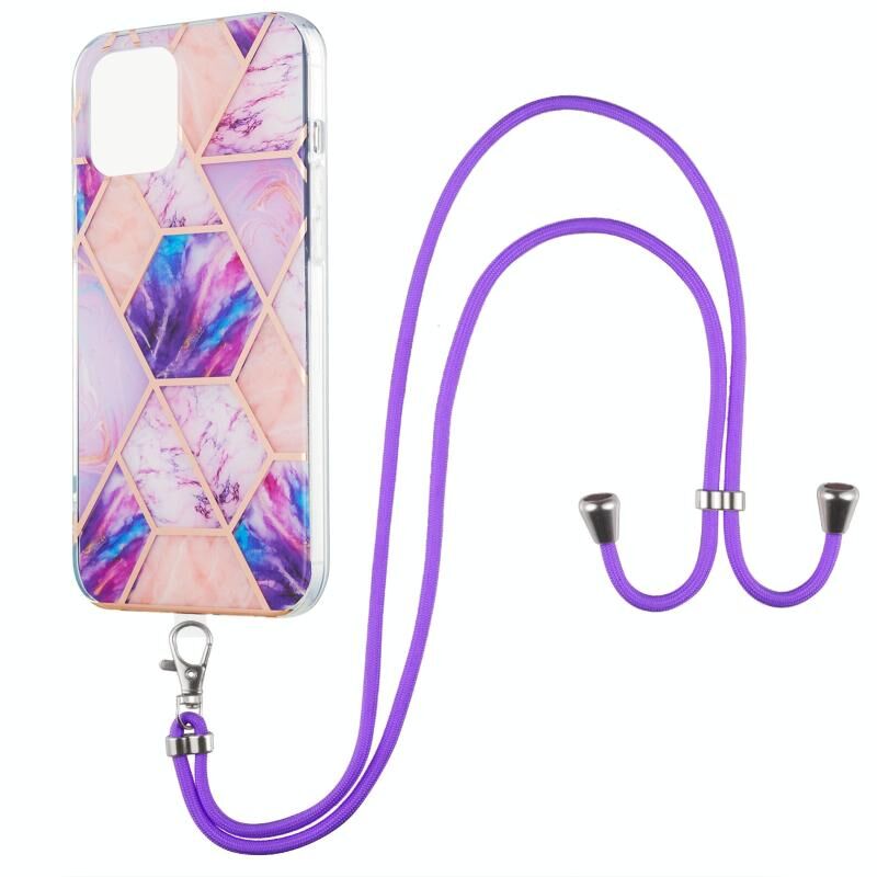 For iPhone 13 Pro Electroplating Splicing Marble Pattern Dual-side IMD TPU Shockproof Case with Neck Lanyard (Light Purple)