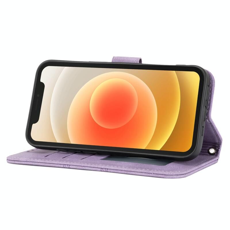 For iPhone 13 Pro Embossed Striped Magnetic Buckle PU + TPU Horizontal Flip Leather Case with Holder & Card Slot & Wallet & Photo Frame & Sling (Purple)