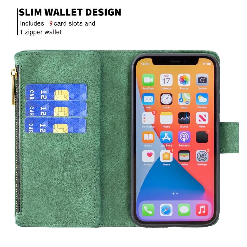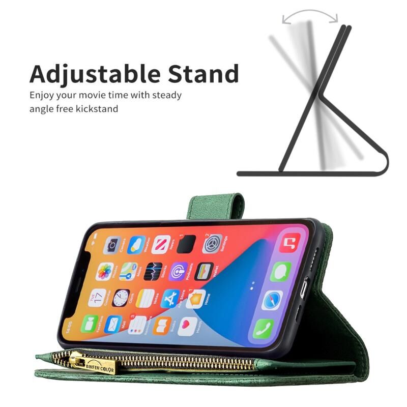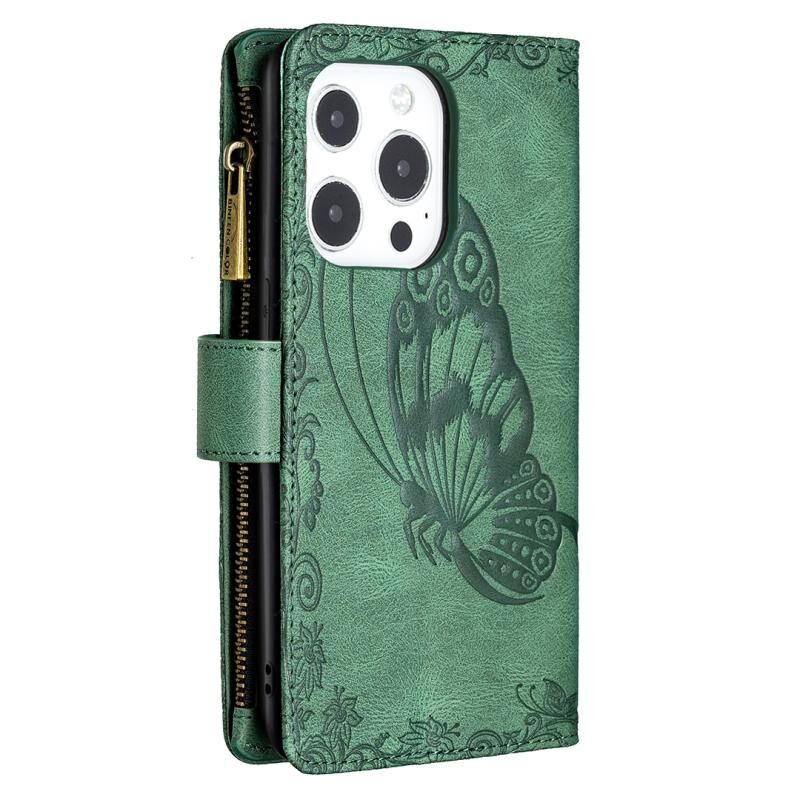 For iPhone 13 Pro Flying Butterfly Embossing Pattern Zipper Horizontal Flip Leather Case with Holder & Card Slots & Wallet (Green)