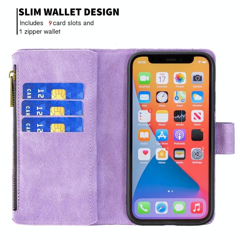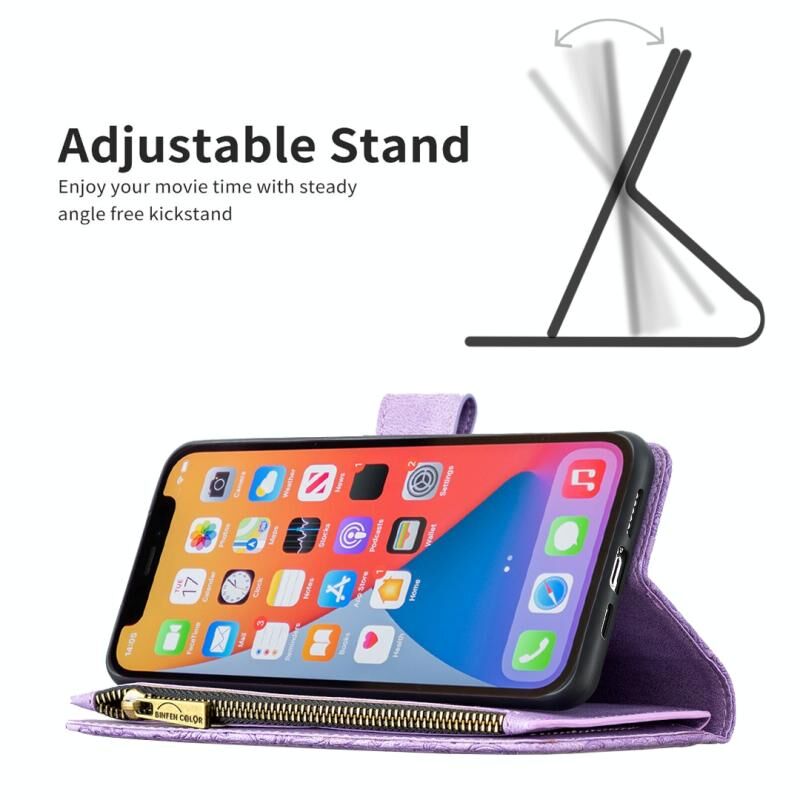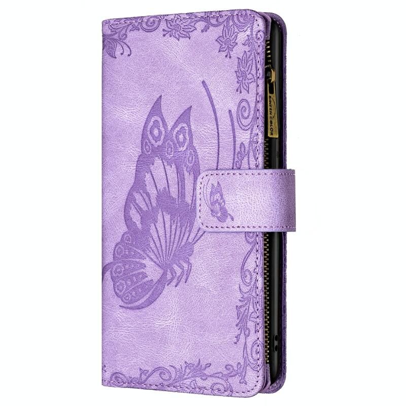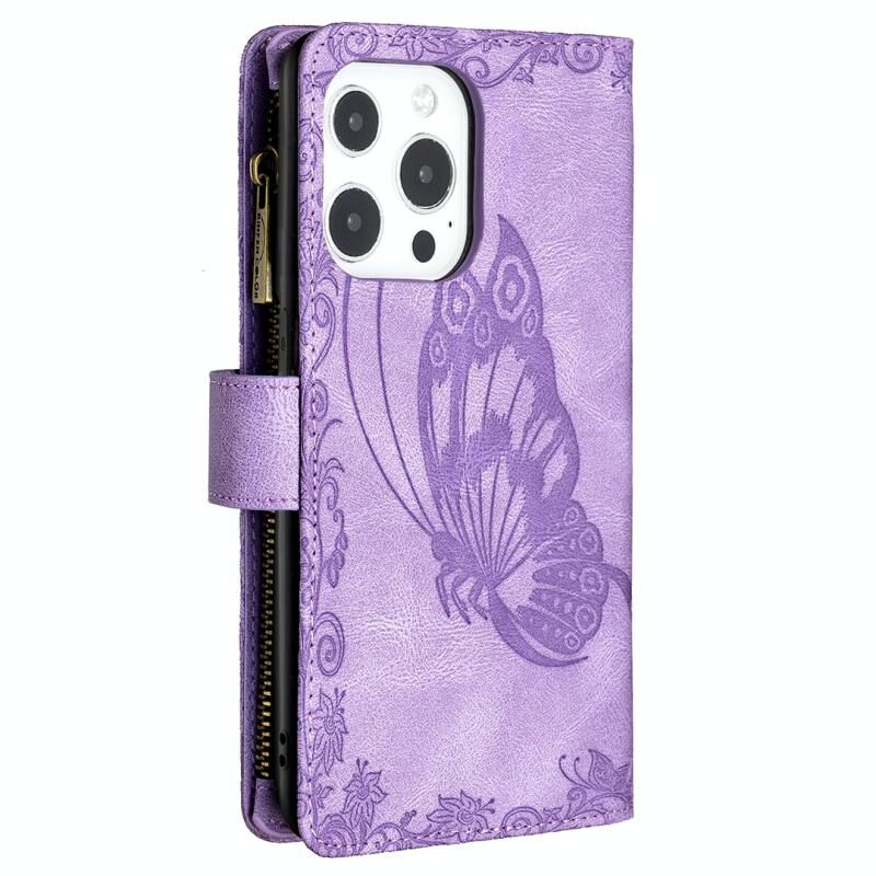 For iPhone 13 Pro Flying Butterfly Embossing Pattern Zipper Horizontal Flip Leather Case with Holder & Card Slots & Wallet (Purple)