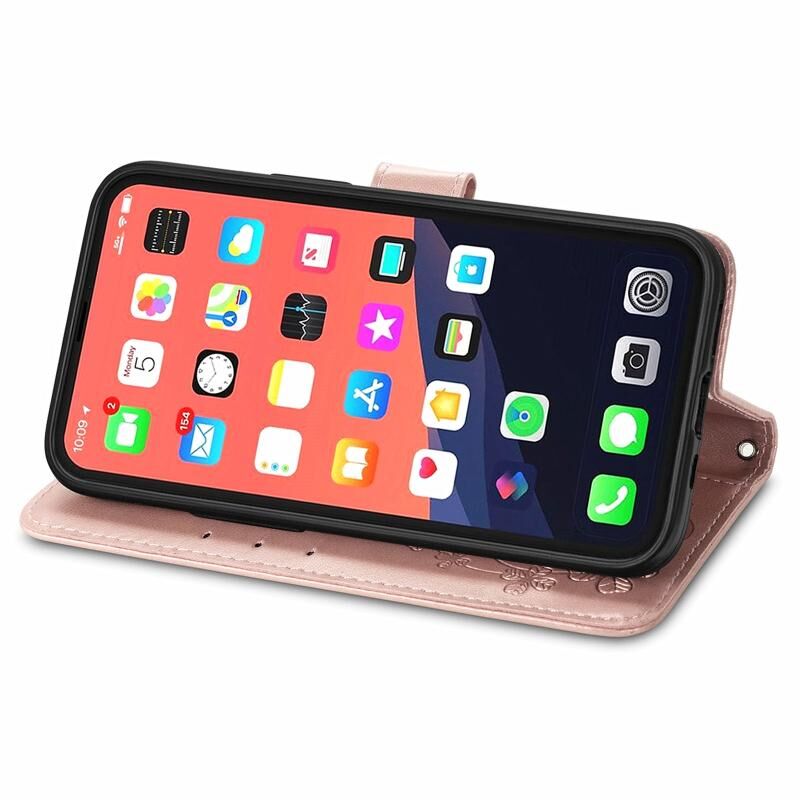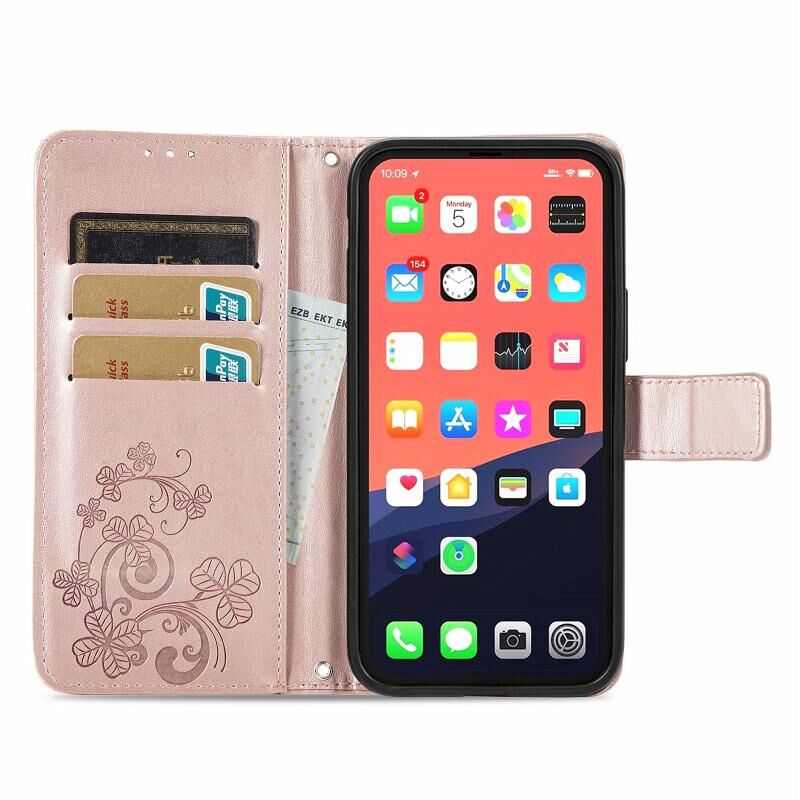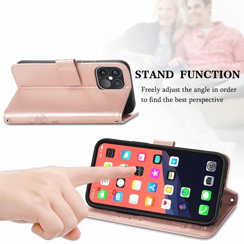 Θήκη δερμάτινη για iPhone 13 Pro με σχέδιο τριφυλλιού, ανάγλυφη αγκράφα, προστασία κινητού, λουρί, θήκη για κάρτες, πορτοφόλι και λειτουργία βάσης (Χρυσορόδινο).