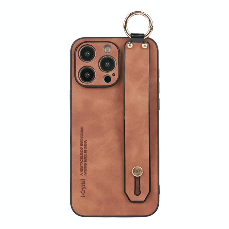 For iPhone 13 Pro Lambskin Wristband Holder Phone Case(Khaki)