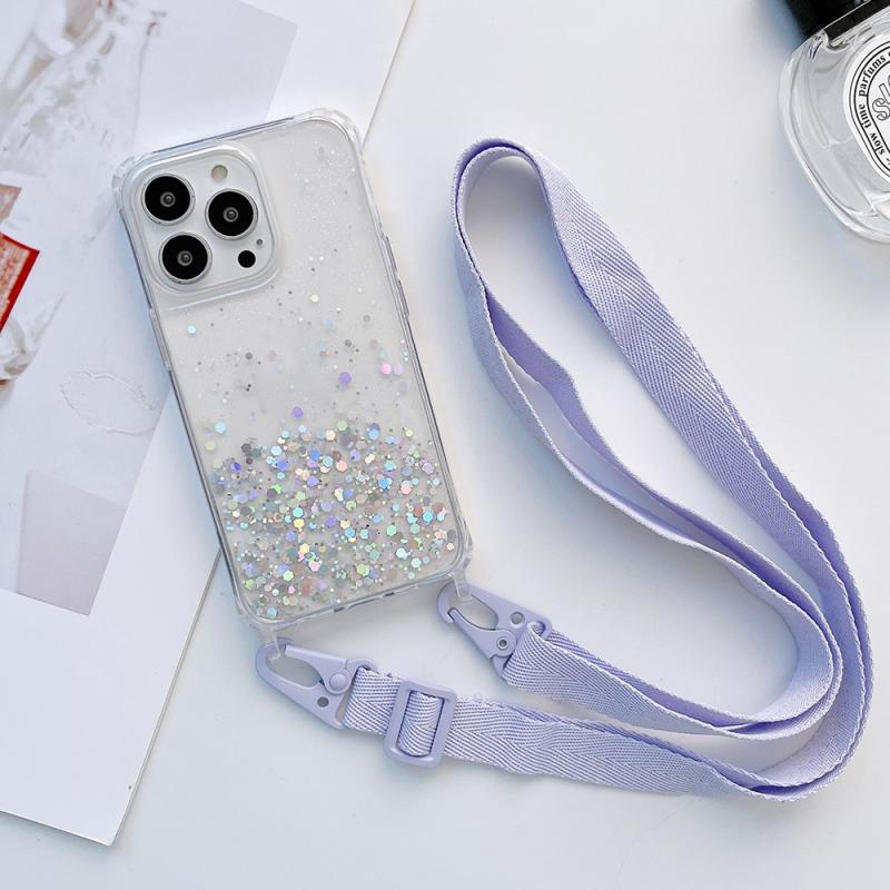 For iPhone 13 Pro Lanyard Glitter Epoxy Clear Phone Case (Purple)