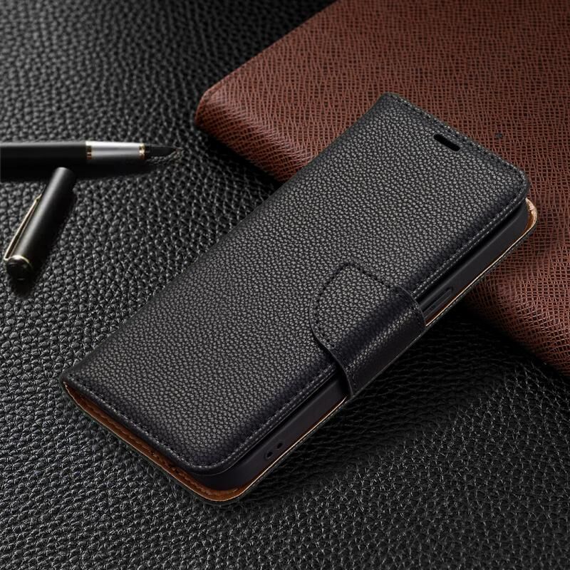 Θήκη δέρματος οριζόντιας αναδίπλωσης για iPhone 13 Pro με υφή Litchi, απλό χρώμα, με βάση, θήκες καρτών, πορτοφόλι και λουρί (Μαύρο)