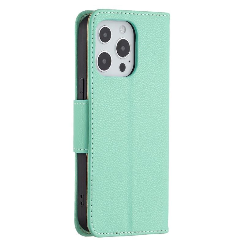 Θήκη δέρματος οριζόντιας αναδίπλωσης για iPhone 13 Pro με υφή Litchi, απλό χρώμα, με βάση, θήκες καρτών, πορτοφόλι και λουρί (Μαύρο)