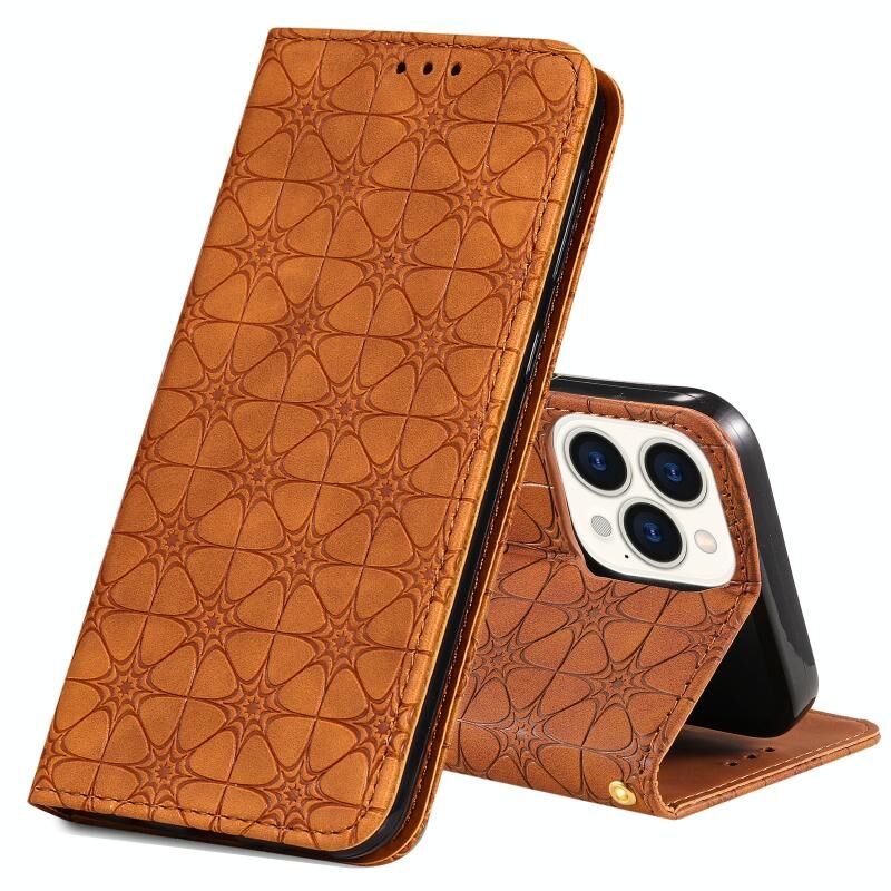 For iPhone 13 Pro Lucky Flowers Embossing Pattern Magnetic Horizontal Flip Leather Case with Holder & Card Slots (Yellow Brown)